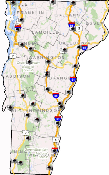 Live traffic cam locations in Vermont are indicated on the map above. Click on the camera icon on the map to view each live camera location in VT. Links to all Vermont state traffic cams are also on the left side navigation.